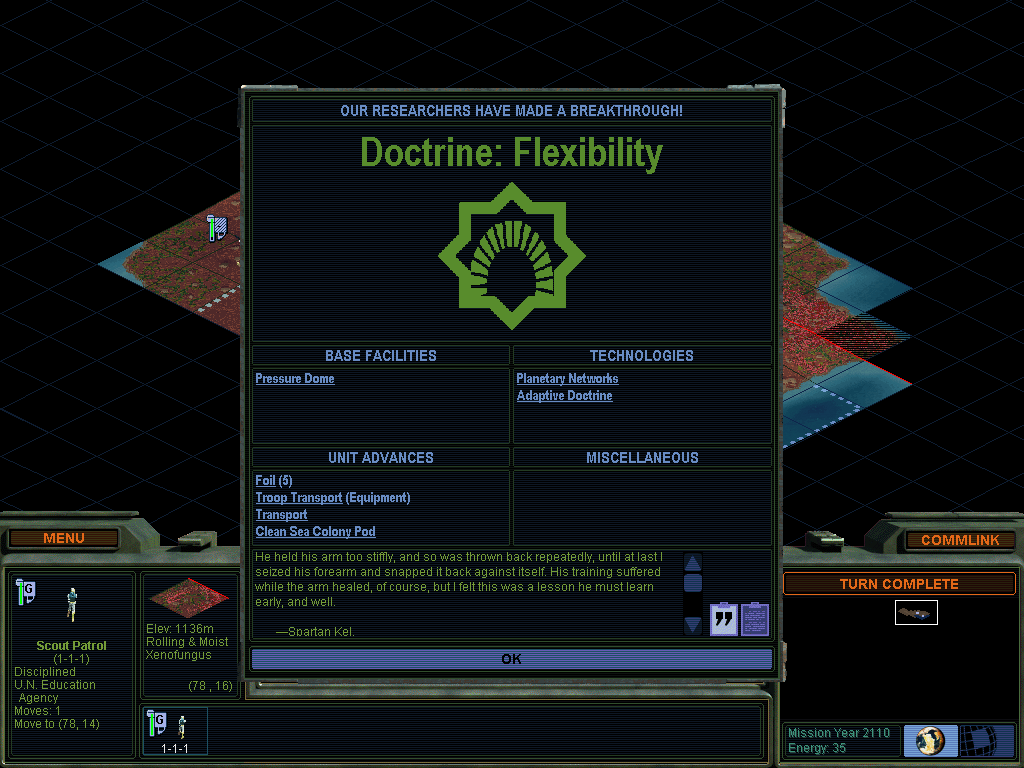 The Spartan Federation – New beginnings Hello, welcome to my new AAR. This time we are playing as Santiago and The Spartan Federation. This game is played with Will to Power mod on v. 117. There were quite a few changes since my last AAR that was played on v. 43 (http://alphacentauri2.info/index.php?topic=21438.0) so i expect to see quite a few new things. Gonna make this one simpler and shorter – and hopefully fun as well. I am playing mostly blind, I read some change logs, but didn't play a game in a while. The game is on Transcend difficulty, random small map with standard vanilla AC2 factions. Spartans have morale and police bonus, both very important in WTP. The mod has units starting with very green morale and morale upgrades are generally harder to acquire. There are also more techs so free prototyping is better bonus than in vanilla. Sparta Command Sparta Command module successfully landed after the Unity spaceship orbital disaster. There was no time for choosing the perfect location, but navigators managed to hit the land and what looked to be nearby radioactive field. Landing module is packed with extra colony pod and two formers that will help initial colonists. First task of the trained Spartans is to scout the surrounding of the new world. There's no telling what could be found – Earth's technology could not scan the plan and due to unfortunate circumstances there was no time to get planet scans from Unity. Sparta has the good rainy river field nearby where colonist can gather food and start power supply. Colony pod is moved to radioactive field to establish new outpost base – Santiago immediately wanted to get the foothold there as radioactive materials meant one thing – powerful weaponry! As soon as they left the base Scouts find mysterious artifact. It seems to be definitely artificial, almost like some kind of alien technology tightly packed in its strange case. There doesn't seem to be obvious way to open or use the thing. Santiago orders the scientist to lock the thing until they are sure its not some kind of Trojan package. Scouting continues – from now on Scouts are on high alert due to possible contacts with alien races. First contact And it happens soon after. Scouts found Unity pod that should have contained useful equipment of some kind, but instead they were attacked! Some kind of alien creature launched weird projectiles from nearby slime field. Scout retaliated in killed the creature in fire fight – good that Spartans put the highest emphasis on military trainings. They are survivalist after all. Spartans also notice that earth bases and machines seem to attract alien creatures, new attacks are to be expected. Scout rovers Sparta Command trained new scout defender to bolster its defenses and started working on mobile Scout rover. The technology and design were preserved from Unity as a symbol of faction strength. Formers finished the farm on nearby hill field, but it doesn't appear to significantly improve food yield. A small setback, it looks like this planet, now called Chiron, works a bit differently than earth. Not a total surprise.. there's more to learn about new planet's climate. Fort Survivalist base is settled on the coast in nearby radioactive field. It appears to be mostly Uranium; the area will be great energy source. Fort was established on the coast of what seems to be large ocean. It was a strategic decision as Sparta Command does not have immediate ocean access. Another factor was unknown surroundings as colony pod was unprotected and alien creatures seem to be abundant. Technology development In M.Y. 2106. new bases were finally settled sufficiently to be able to organize first serious science and engineering projects. Spartans focused on their strength, putting the money into science of weaponry. Scouts uncover a new Unity colony pod – this one contained comm link to Sister Miriam of the Believers. Santiago contacts Miriam and she starts her long introduction and turns it into scripture babble at which moment Santiago interrupts her and cuts to the real deals. Believers might be misguided, but they are certainly crafty and capable people and Santiago uses the opportunity to trade for their Recreation Commons facilities. It was fitting in a kind as religious people tend to care and comfort the weak, they already found a good way to turn claustrophobic bases on alien planets into more habitable surroundings. Santiago was not really that interested in comfort, but soldiers need to get some rest after hard trainings and there are civilians out there also – one cannot function otherwise. Miriam also wanted to trade her maps. Believers were situated to the east on almost certainly small continent. Santiago started to believe Chiron is actually mostly ocean world, land near Sparta looks to be completely cut off by the ocean from the north side and the base located in the southern hemisphere. Another interesting feature of the maps were two large alien monolith structures. In following years Spartans develop three important technologies. New Laser weaponry in 2109, Particle Weapons in 2113 and Biology Labs in 2119. This chain of event boosted their understanding of alien planet and creatures and created foundations for strong military faction. Chironquake !? An unusual disturbing earthquake turns out to be quite convenient to Spartans. When scouts activated unity pod in the east something triggered the earthquake and land significantly rose in short period of time. There doesn't seem to be nearby volcano on the surface, though down below its safe to assume there is huge lava pool. Its also weird that earthquake coincided with Unity pod discovery in time and location, that should be unnatural, or one in a billion chance hit. It was impossible to tell. Whatever the case, Spartans got a new patch of land and their continent was now significantly larger than what Believers had. Sparta Command retools its production to Colony pod, there 