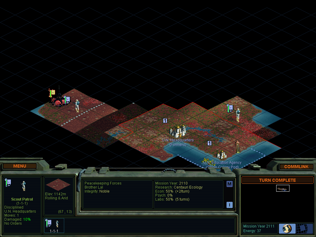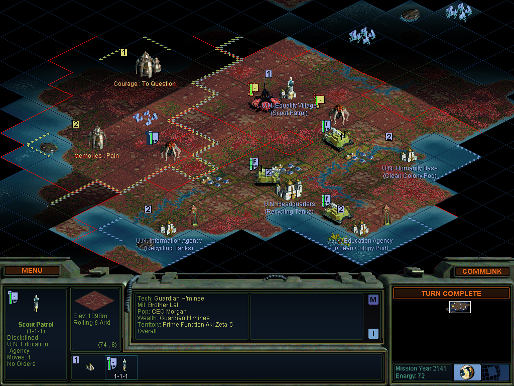 Brutal Dawn is a mod that simulates a more plausible model for high-tech extra-planetary colonization. Vanilla SMAC derives from Civilization and Civilization II, which try to simulate real life population expansion patterns. Unfortunately, those patterns are the exact opposite of what would be found on Chiron. Historically, every group from hunter-gatherers to early modern civilization suffered the same set of basic challenges. While it was easy for these groups to expand into new territory, they had difficulty extracting resources from the land they controlled. Roman technology, for example, could never support a population anywhere near as high as modern Italy. Also, earlier peoples tended to exist in a state of permanent population boom, with population curtailed by disease, warfare or starvation (resource failure.) However, it was easier for people to solve the problem of expansion than to solve the problems of disease or starvation. Europeans reached the Americas long before the Industrial Revolution. Chiron colonists would suffer the opposite problems. With their efficient agriculture and advanced resource processing techs, their population wouldn't be constrained by food. Rather they would be constrained by the social factors which have lowered the birth rate in the modern centuries. In Planet's inimical environment, each new base would represent a major technical challenge. You can't just sail to Cape Cod and build a few wood cabins! You need life support, electricity, nutrient processing, mineral refining, etc. Brutal Dawn's main gimmick is vastly increasing both the growth rate and the cost of colony pods. You get fewer but much more powerful bases. The backbone of the mod is Alpha Centauri Bear's excellent Will to Power project. Chapter 1: We're using the standard sized Map of Planet. We land in the eastern continent south of the Mesa. Each faction begins with four Unity Agri-Bots or rover formers, so you can get to work right away. They have the radar special ability, so you can rapidly get a sense of your surrounding. For reasons I don't understand, the AI somehow builds Agri-bots on occasion, even though they're a custom unit that don't occupy a space on the tech tree. Not a big deal. Each faction also begins with four specialized colony pods with the drop pod feature, allowing rapid founding of your four initial bases. We airdrop into key positions and found our faction. It doesn't affect gameplay but I've changed the value of [...] Brutal Dawn: Volume 1: Morgan Industries