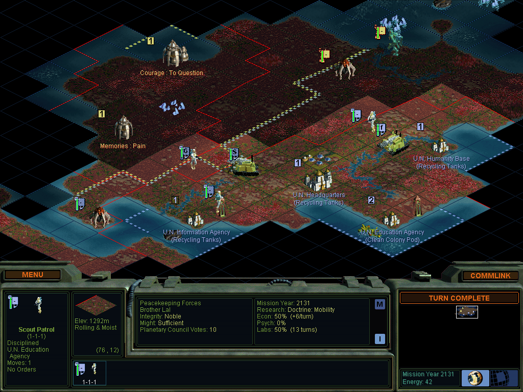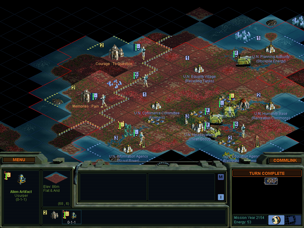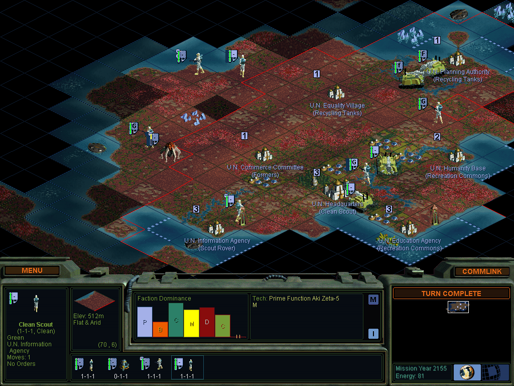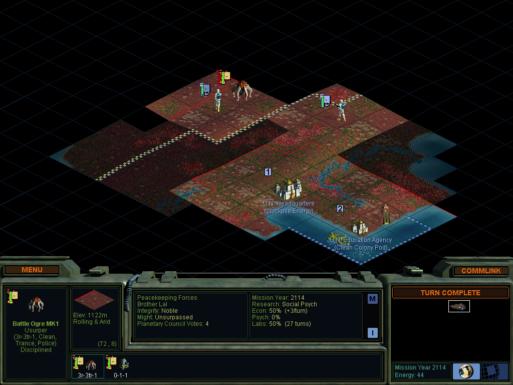 While Thinker focuses on improving AI and providing configuration options, Will to Power makes an effort to completely rework the game in order to patch exploits and finally bring about True BalanceTM on Alpha Centauri. Among its many changes, and likely the most significant, is that combat is now weighted more strongly in favour of the defender, with huge bonuses to base defense and fighting on one’s own territory. Any war between factions is destined to be a protracted, drawn-out affair, defined by attrition and won atop a hill of mangled corpses and broken rovers. So of course, we’re going to completely ignore all of that and instead wage war using purely economic means. For as we all know, money is power… This is a PBEM game played between myself and Nevill, using version